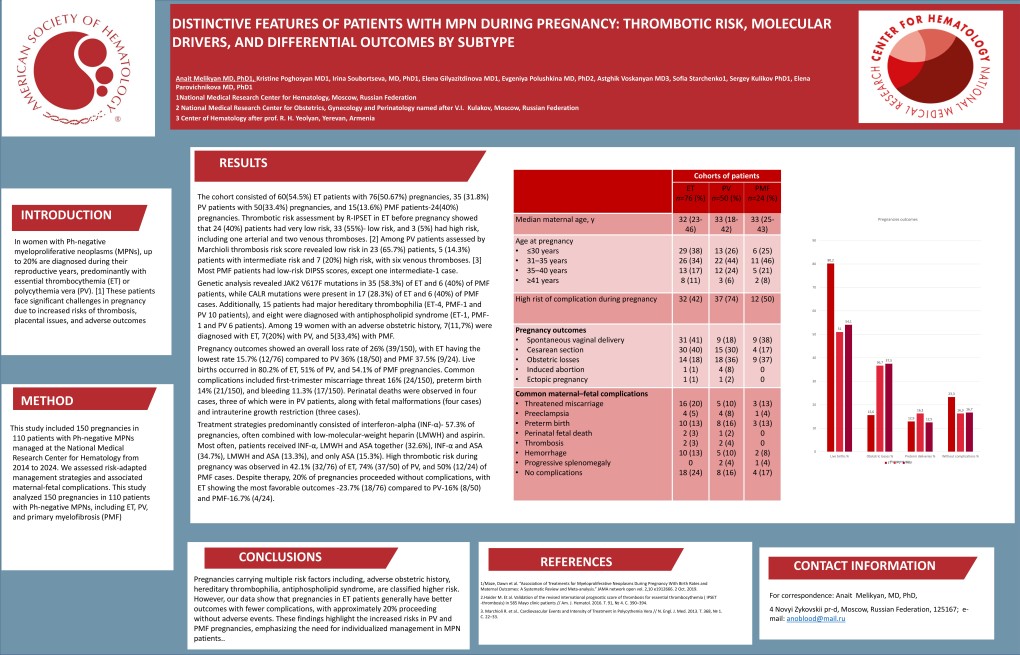 The topic of the second poster: “Distinctive features of patients with MPN during pregnancy: Thrombotic risk, molecular drivers, and differential outcomes by subtype,” authored by Doctor of Medical Sciences, Head of the Clinical Diagnostic Department for the Standardization of Treatment Methods of Hematological Diseases Anahit Melikyan, with co-authors from this and other clinical and laboratory departments of the NMRC for Hematology.