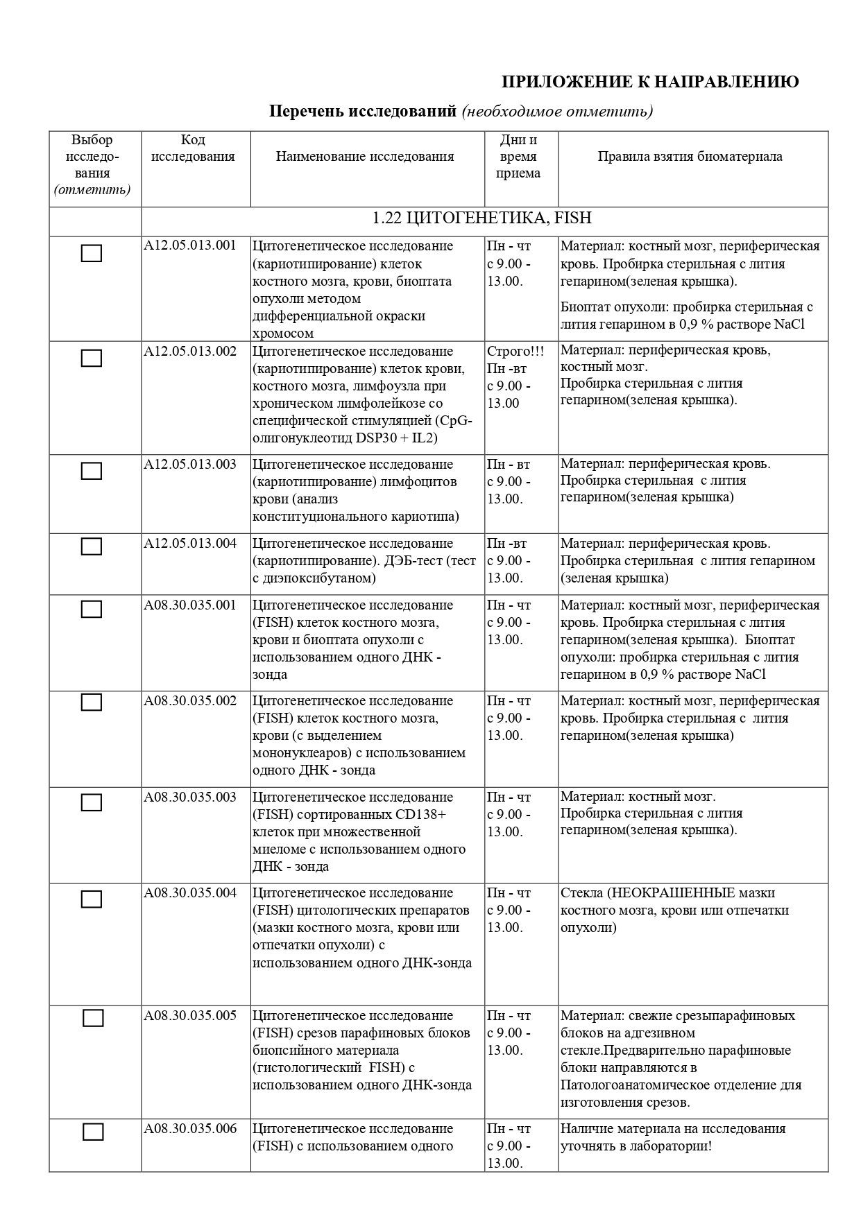 - Цитогенетическое исследование (кариотип). Цитогенетическое исследование (кариотипирование) лимфоцитов крови (анализ конституционального кариотипа) (A12.05.013.003) — пн—вт с 9:00 до 13:00;