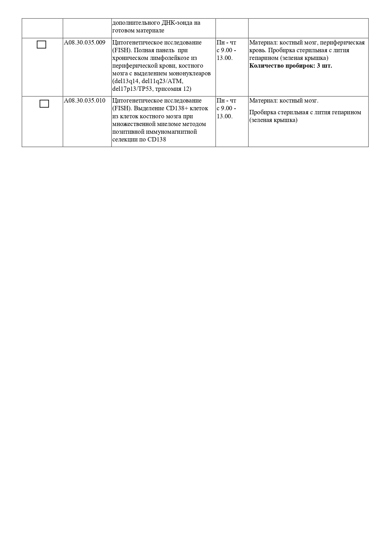 | A08.30.035.002 | Цитогенетическое исследование (FISH) клеток костного мозга, крови (с выделением мононуклеаров) с использованием одного ДНК - зонда | Материал: костный мозг, периферическая кровь. Пробирка стерильная с лития гепарином (зеленая крышка) |