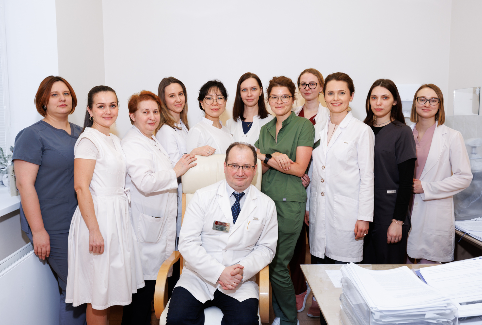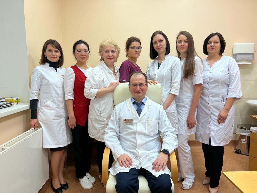 Сидит: заведующий отделением- врач-гематолог, д. м. н. Звонков Евгений Евгеньевич. Стоят слева направо: врач-гематолог, научный сотрудник, к. м. н. Смольянинова Анна Константиновна; врач-гематолог, к.м.н. Бадмажапова Дарима Сэмункоевна; врач-гематолог, научный сотрудник, к.м.н. Габеева Нелли Георгиевна; врач-гематолог Щецова Ольга Олеговна; врач-гематолог, к. м. н. Королева Дарья Александровна; врач-гематолог Беляева Анастасия Валерьевна; врач-гематолог Татарникова С.А.